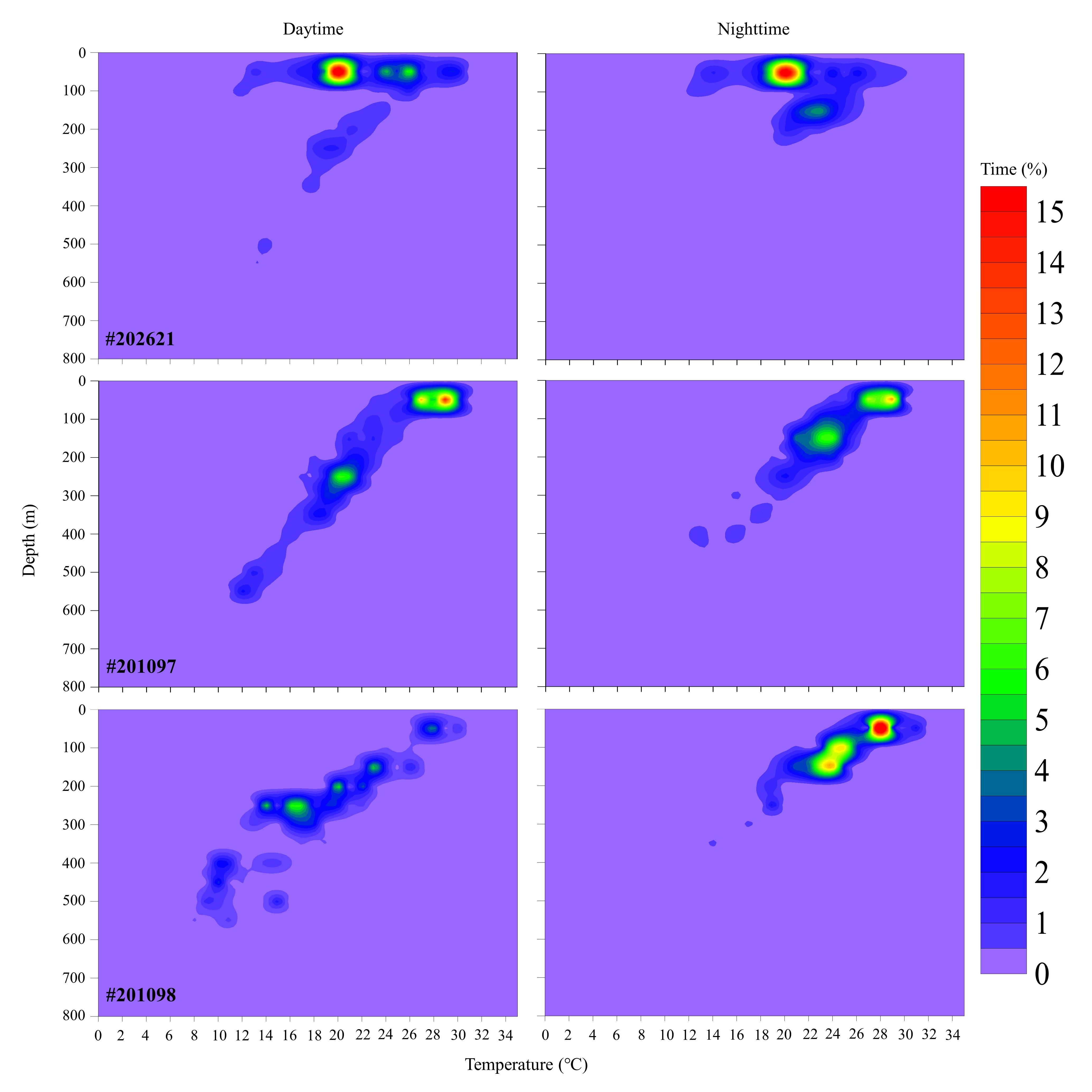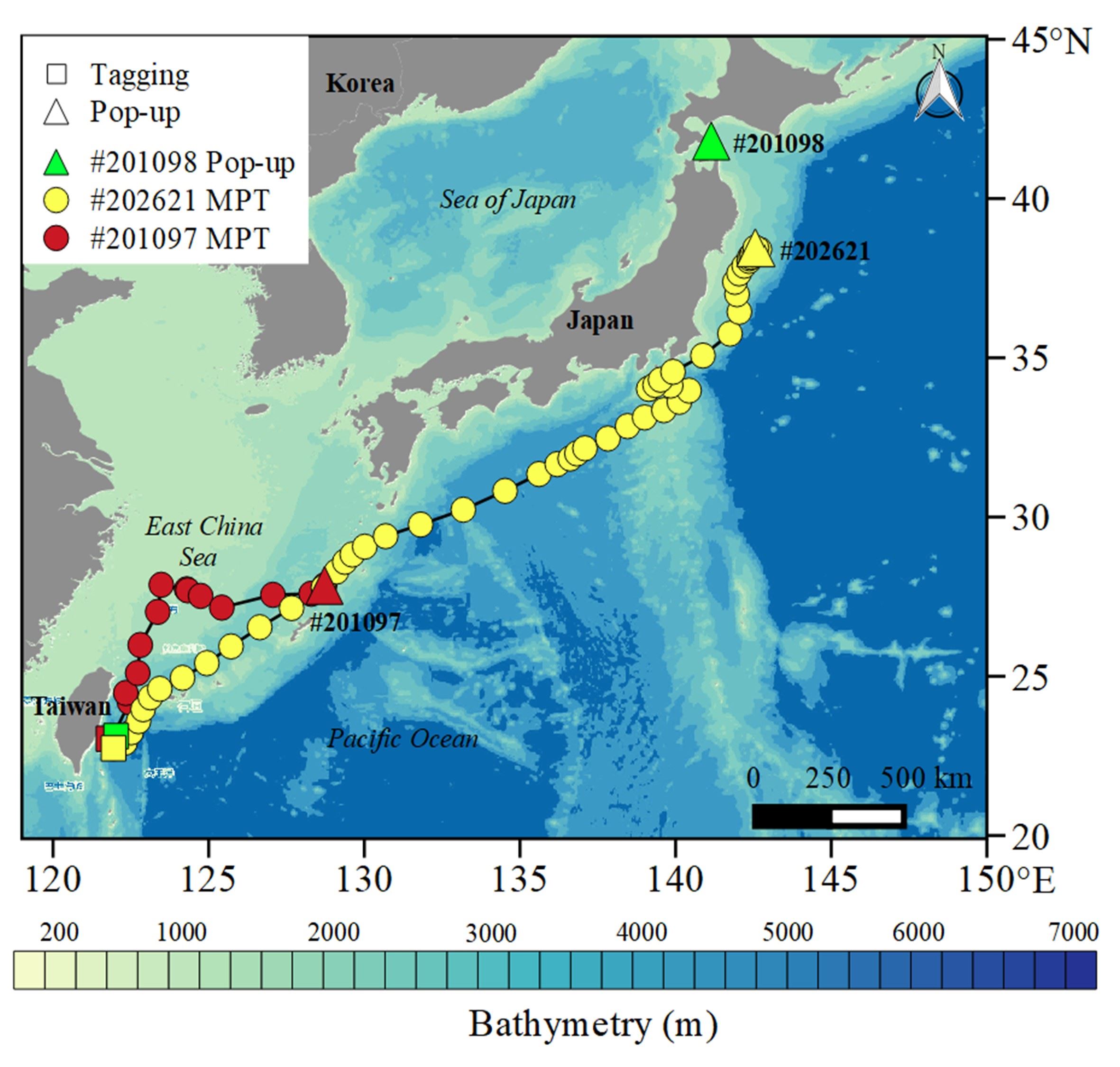 水試所說明,為進一步解明太平洋黑鮪的產卵洄游特徵與生態習性,該所嘗試進行其衛星標識放流試驗,歷經5年的努力,在2021年5月成功將彈脫型衛星標識記錄器配置於3尾太平洋黑鮪成魚(編號#202621、約200公斤;#201097、約300公斤及#201098、約180公斤),該些標識器分別歷經53天17小時、13天4小時及60天16小時後彈脫,累計資料記錄時間達127天13小時,記錄範圍從臺灣東部外海經日本沖繩島至北海道南部海域,直線移動距離長達3,000公里以上;太平洋黑鮪日夜移動行為具顯著差異,夜間喜棲息於溫躍層(約200公尺)以內的水層,白天則多半活動於較300至500公尺深的海域。