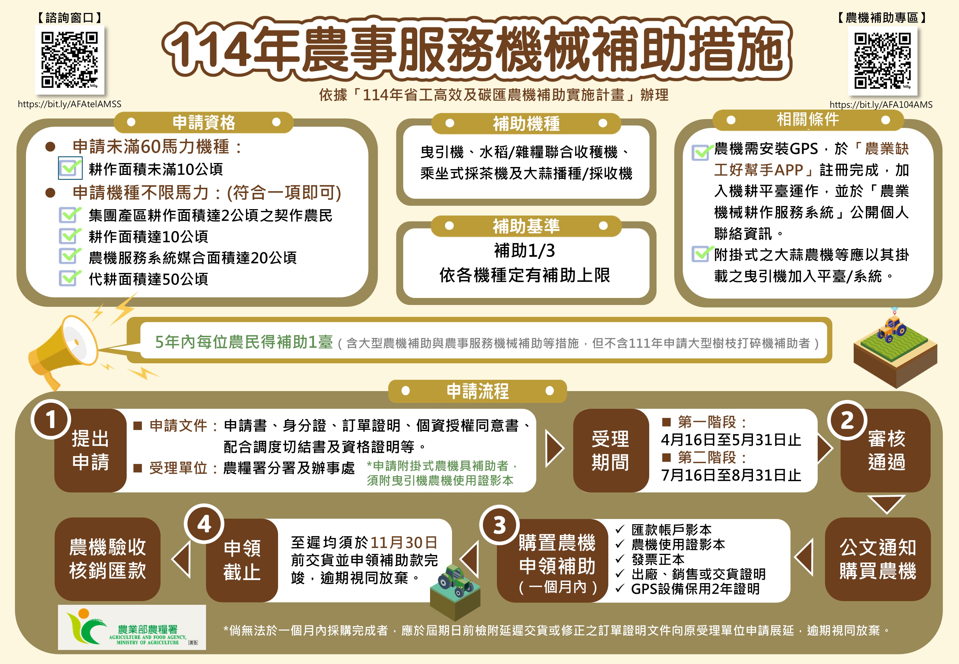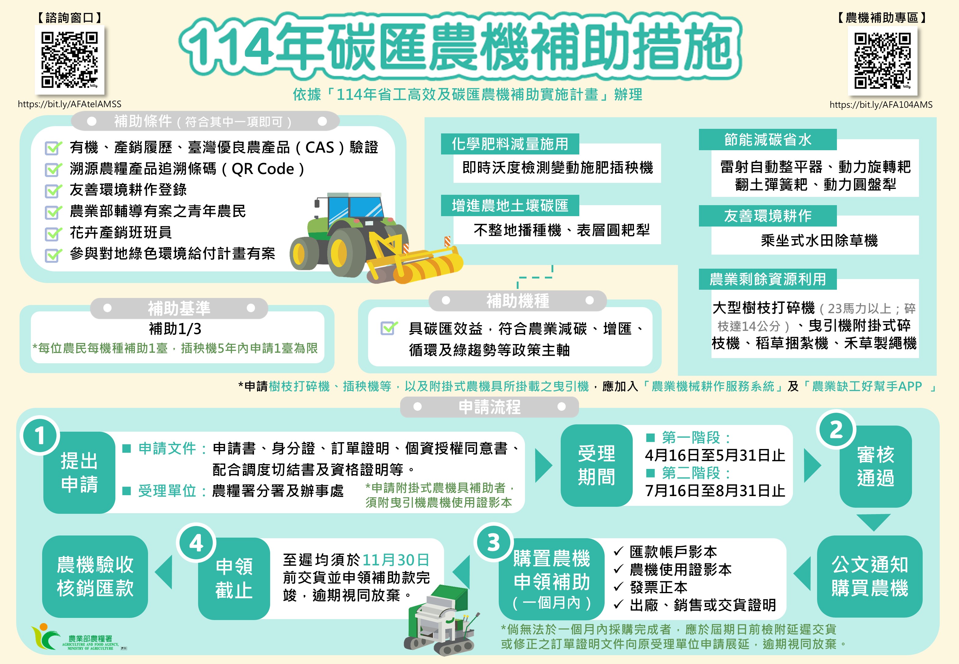 農糧署表示,為補助實際耕作之農友,小型機種申請資格廣納三章一Q(有機、產銷履歷、CAS驗證、溯源農糧產品追溯條碼)、友善環境耕作登錄、農業部輔導之青農、花卉產銷班員及綠色環境給付計畫有案者;大型機種則為避免農友貿然投入,反而造成經營負擔,以集團產區、耕作或代耕達一定面積者為補助對象。另審查通過之農機補助牌型與供應廠商清冊已公布於該署全球資訊網(https://www.afa.gov.tw/)「農機補助專區」項下,敬請農友參採選購,保障自身權益。