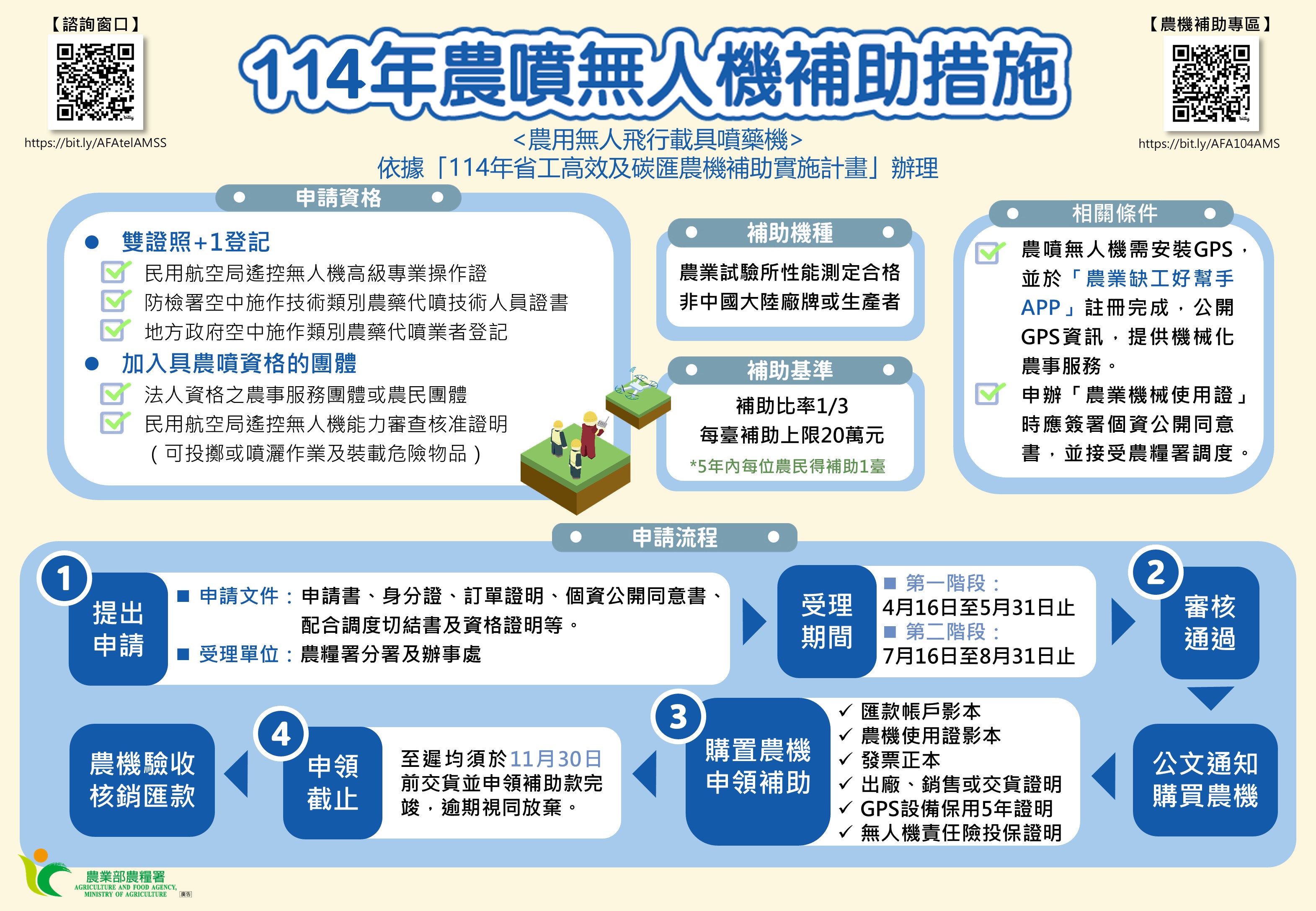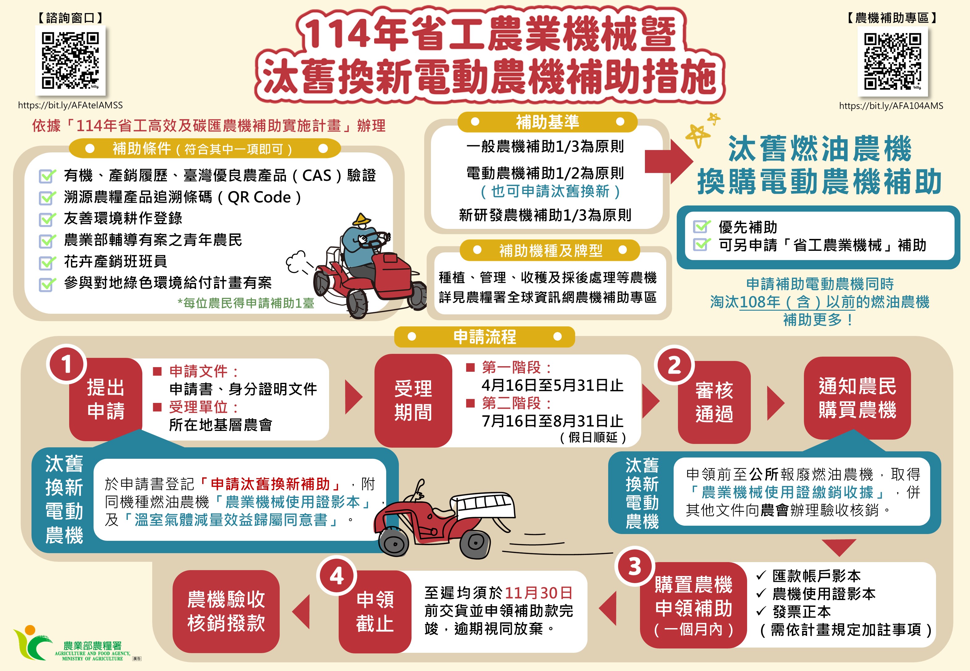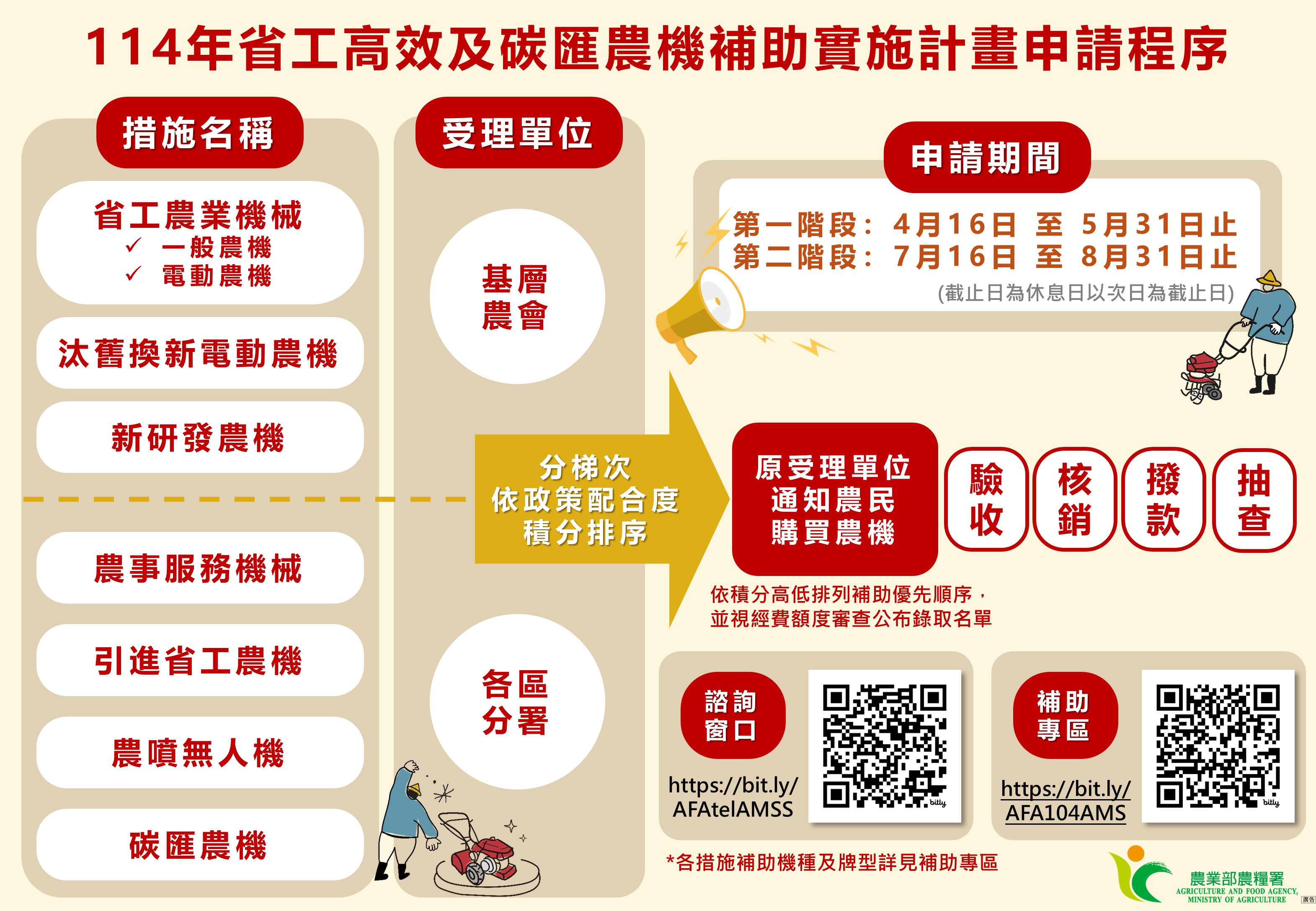 農業部農糧署持續輔導農友購置種植、管理、收穫及採後處理等農耕普遍使用之省工農機,推動省工高效及碳匯農機補助實施計畫,包含省工農業機械、新研發農機、農事服務機械、農噴無人機、引進省工農機、碳匯農機及汰舊燃油農機換購電動農機等補助措施,補助比例以1/3為原則,電動農機提高補助比例以1/2為原則。補助計畫第二階段自本(114)年7月16日起受理申請,受理期限因假日順延至9月1日(含)止,請有需要的農友把握機會,儘速提出申請。