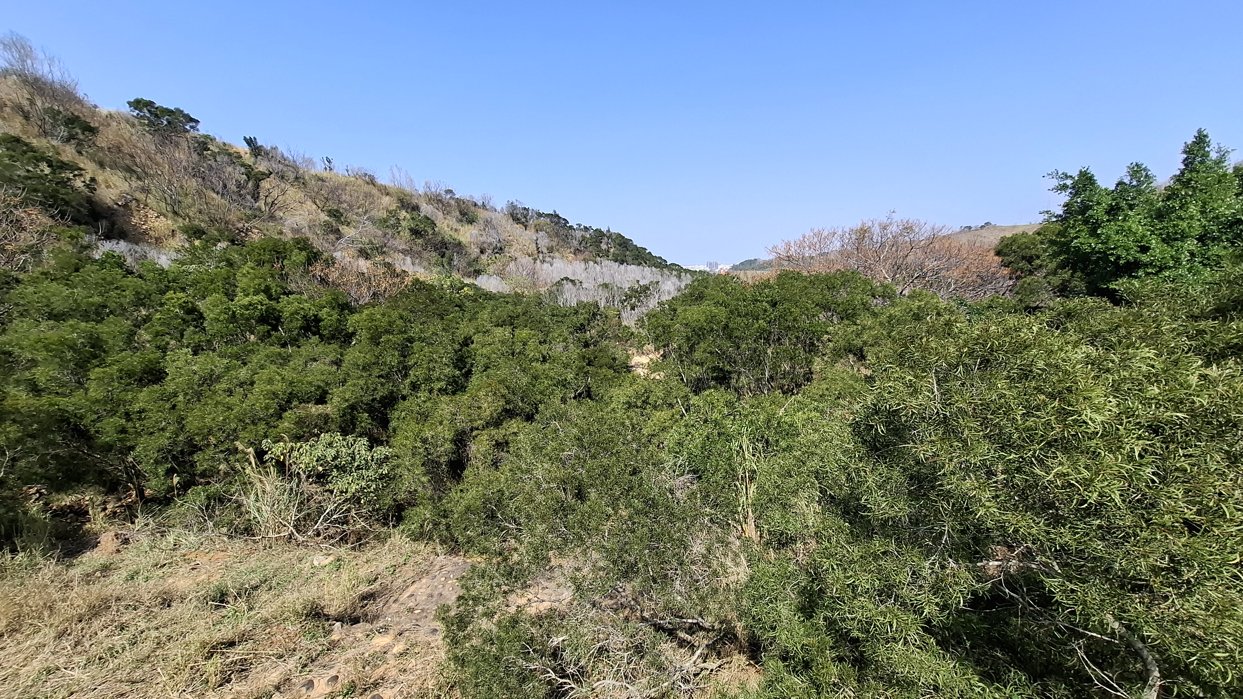 位於臺中市沙鹿區的鹿寮南溪,座落於國土綠網中大肚臺地淺山保育軸帶,關注物種有石虎、穿山甲、環頸雉等保育類動物,是林業保育署臺中分署積極推動的保育區域;然而從102年衛星影像中觀察,鹿寮南溪河床曾為大片裸露的黃褐色卵礫石堆積。為了抑制土石下移與強化溪流穩定,該分署於111年起,運用現地卵石,以多孔隙卵石固床工與生態護岸等治理工程,歷經4年的努力,近期除可清楚看到溪流兩側綠意盎然,現地調查濱溪地帶也逐漸恢復原生植被,生態系正逐步重建。