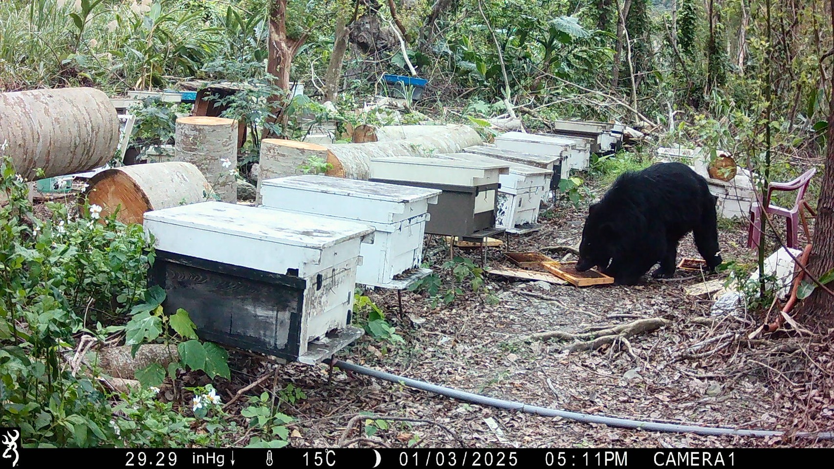 今年1月林業保育署花蓮分署接獲蜂農池明鎮通報有黑熊闖入蜂場,到場後發現超過20座蜂箱被破壞,還留下熊窩與排遺。池明鎮回憶,當天傍晚正準備搬運蜂箱,竟瞥見有隻黑熊悄悄將蜂箱拖入草叢「大快朵頤」。在約20公尺外的漆黑山林中,一雙亮亮的眼睛直盯著他。人熊就這樣彼此相互安靜對視近40分鐘。