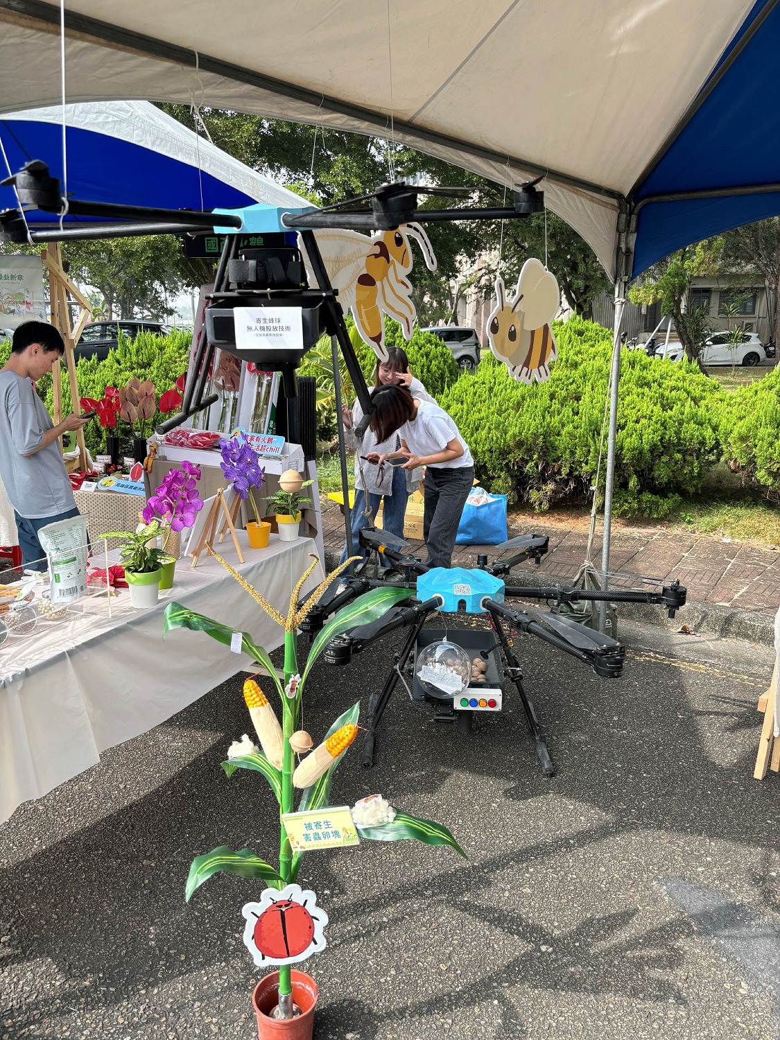 為推廣農民以赤眼卵寄生蜂防治玉米秋行軍蟲及玉米螟等害蟲,並減輕田間施用天敵的人力負擔,農業部花蓮區農業改良場與中國文化大學、動植物防疫檢疫署、台糖公司合作,開發「寄生蜂球」及「GPS定位無人機投放技術」,每公頃只需5-10分鐘,即可快速又精準地完成蜂球投放工作,相較於傳統手釘蜂片,效率提高6-10倍以上。