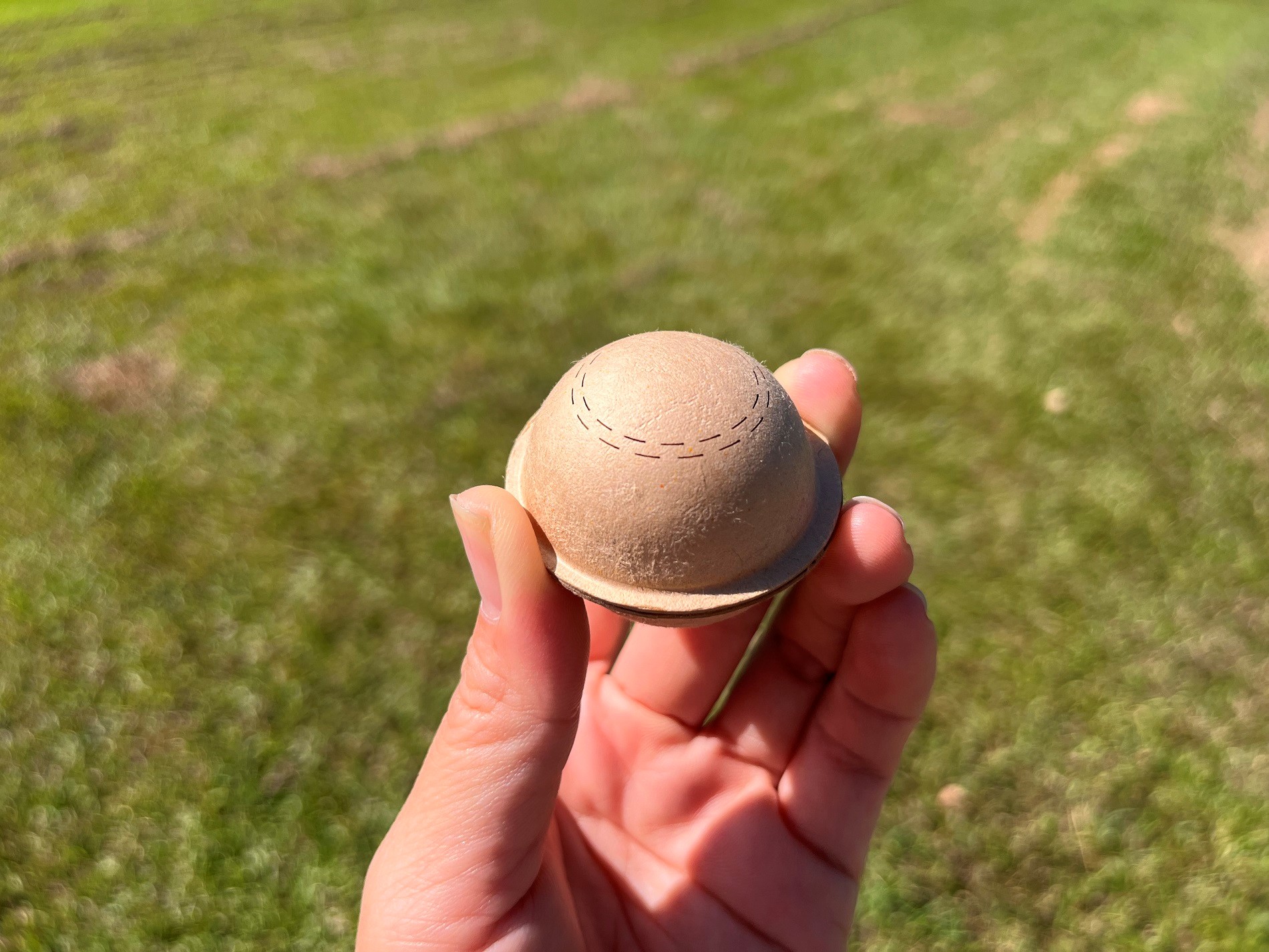 以往田間施放赤眼卵蜂,是以人工方式將蜂卵片釘於玉米葉片背面中央,每隔10公尺放置一片,每公頃約放置121片,需花費1-2小時,十分耗時費工。為提升作業效率,團隊研發新式「寄生蜂球」,其球體設計易於拋投,可大幅節省人力和施用時間。球殼材質容易被土壤分解,對環境友善;球殼上的狹縫寬度則是依據赤眼卵蜂體型大小量身打造,並以雷射方式裁切,供寄生蜂羽化後由縫隙順利飛出,且避免雨水和螞蟻等外界威脅因子入侵球殼內干擾,維持極佳出蜂品質。該新式蜂球設計已取得新型專利,並且將技術移轉給廠商製造販售。