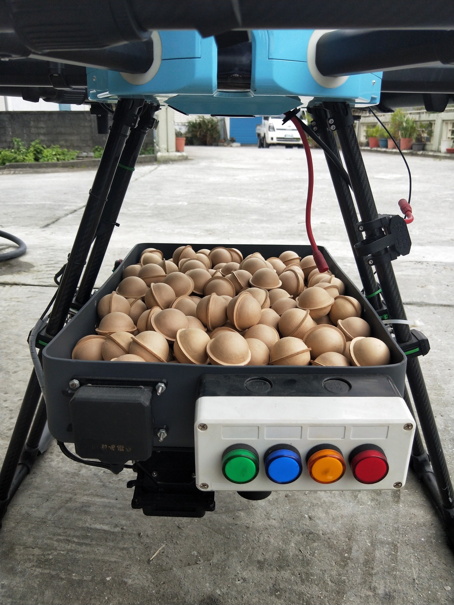 為使新式蜂球能有效率並精準施放於大面積田區,團隊繼續開發「GPS 定位投放球體裝置製造技術」,內容包含球體連續投放機構、GPS定位及雲端操作平台,形成可附掛於無人機的獨立裝置,且不受無人機廠牌型號限制。實際操作時,使用者僅需於雲端操作平台設定預計投放的區域,系統即可自動計算田區面積並規劃投放點座標。該裝置於田間執行飛行任務,途經預設的蜂球投放點時隨即觸發投放裝置,即可輕鬆達成精準且快速的大面積蜂球施放,待1-2天赤眼卵寄生蜂從蜂球羽化飛出,自主完成田間害蟲防治工作。