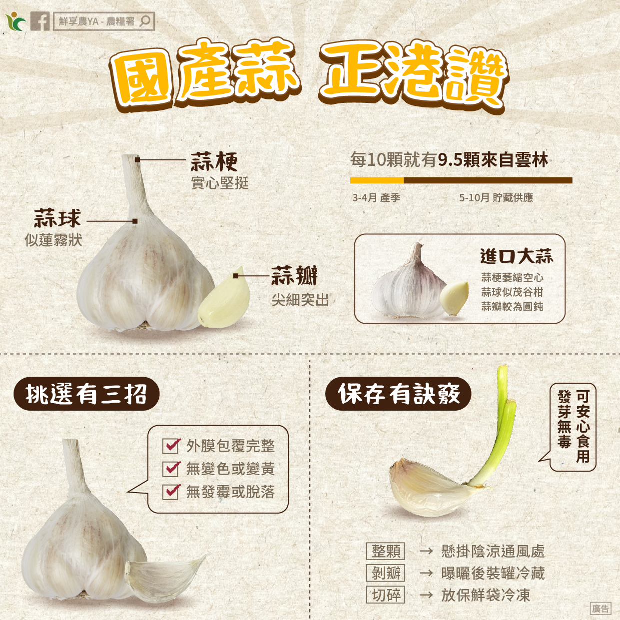 農糧署強調,國產新蒜現正上市,品質優良、風味濃郁,且耐貯性佳。消費者可依蒜球外型辨識來源差異:國產大蒜外型下寬上窄,呈吊鐘狀,外觀近似蓮霧;進口大蒜則多為扁圓形,外觀類似茂谷柑。為便利家庭採購與嚐鮮,該署將輔導產地農民團體推出1至2台斤小包裝產品,供應各大賣場及連鎖超市加強促銷。目前採收之濕蒜含水率較高,消費者買回家後,只需置於陰涼通風處自然風乾,待外皮乾燥後即可長期保存,隨時取用,歡迎消費者把握當季時鮮,多加支持國產優質大蒜。